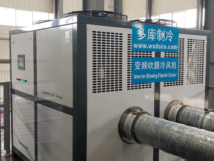 Doco Film Chiller is specially designed for cooling plastic film blowing machine. The working principle is as follows: The chiller refrigerates through the compressor, the indoor ambient air should be cooled from 40-45 ℃ to 10-15℃ through the built-in high efficiency copper tube heat exchanger, and then high-pressure centrifugal blower sends low-temperature air to the inner and outer air rings of the film blowing machine through air duct in order to cooling the film bubble which has just been blown out from the die head, the film bubble can be cooled quickly, all which improves the thickness uniformity of the film, increases the transparency and brightness, accelerates the film setting, enhances the film physical properties and increases output by more than 20-30%.